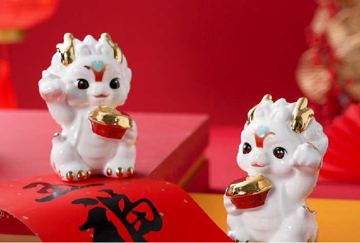 燕之屋龍行龘龘新年禮盒美味與趣味兼?zhèn)?,?nèi)贈燕之屋&永豐源聯(lián)名限定金燕祥龍?zhí)沾蓴[件2個,精致玲瓏,憨狀可掬。兩只小福龍一手捧著碗燕,一手迎燕來,開啟新春好兆頭。面部使用龍鱗花鈿裝飾,龍腳踏祥云紋,身上裝飾福字、飛燕紋等,寓意平步青云、突飛猛進(jìn)、步步高飛,為新春禮贈增添驚喜與樂趣。