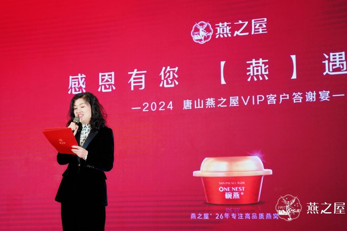 燕之屋* 26年專(zhuān)注高品質(zhì)燕窩(*燕之屋指燕之屋企業(yè)),不僅以匠心工藝和創(chuàng)新科技傳承東方滋補(bǔ)文化,更是以?xún)?yōu)質(zhì)產(chǎn)品和精心服務(wù)滋養(yǎng)每一位消費(fèi)者。晚宴開(kāi)場(chǎng)前,燕之屋輪番播放企業(yè)宣傳片,分享企業(yè)的發(fā)展與榮光,邀大家共同領(lǐng)略品牌文化。傍晚六點(diǎn)零六分,答謝宴在燕之屋唐山市場(chǎng)客服部的舞蹈串燒中拉開(kāi)帷幕。燕之屋唐山合作商、河北法桐商貿(mào)有限公司總經(jīng)理趙寧上臺(tái)致辭,她說(shuō)道:“感謝大家在百忙之中來(lái)參加今天的VIP客戶(hù)答謝宴,使得這個(gè)美好的時(shí)刻更加璀璨奪目。在這個(gè)特殊的場(chǎng)合,我想表達(dá)我們對(duì)每一位貴賓的深深感激。您們的支持和信任是我們前行的動(dòng)力源泉,也正是因?yàn)槟鷤兊闹С?,才有了今年燕之屋在港交所的成功上市(股票代碼:01497.HK)。愿我們今天共享美好時(shí)光,祝各位身體健康,事業(yè)蒸蒸日上!”