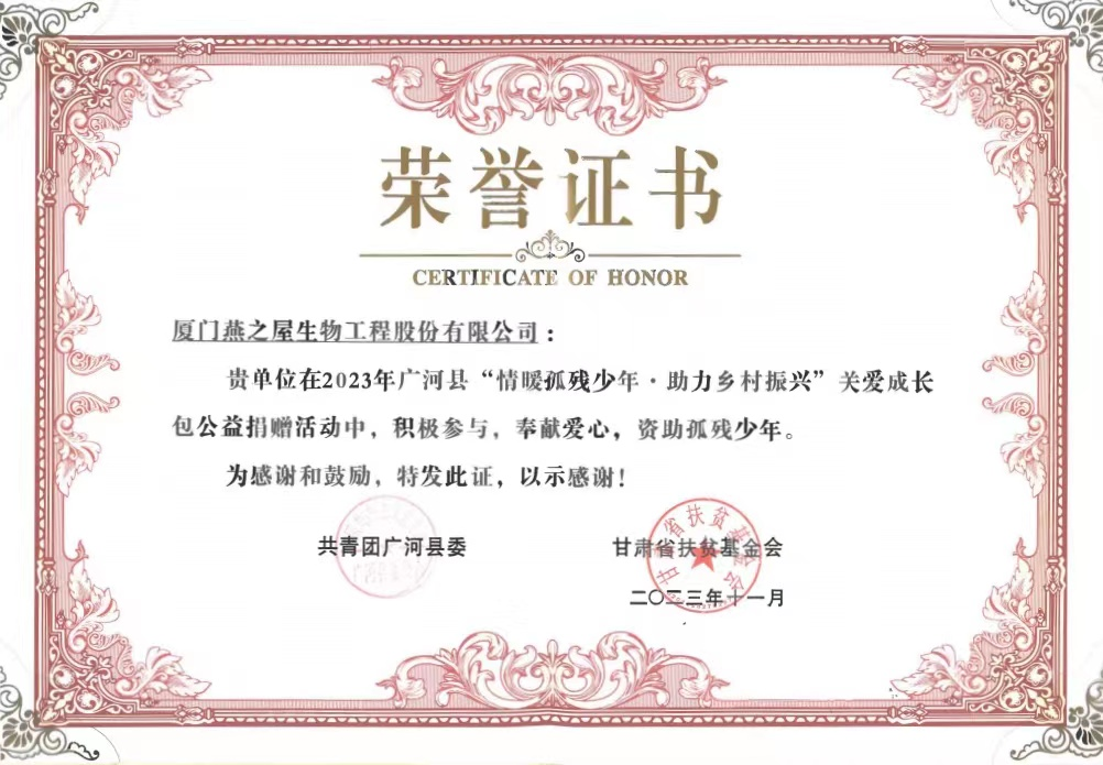 圖:燕之屋榮獲廣河縣“情暖孤殘少年·助力鄉(xiāng)村振興”關(guān)愛成長包公益捐贈活動榮譽證書