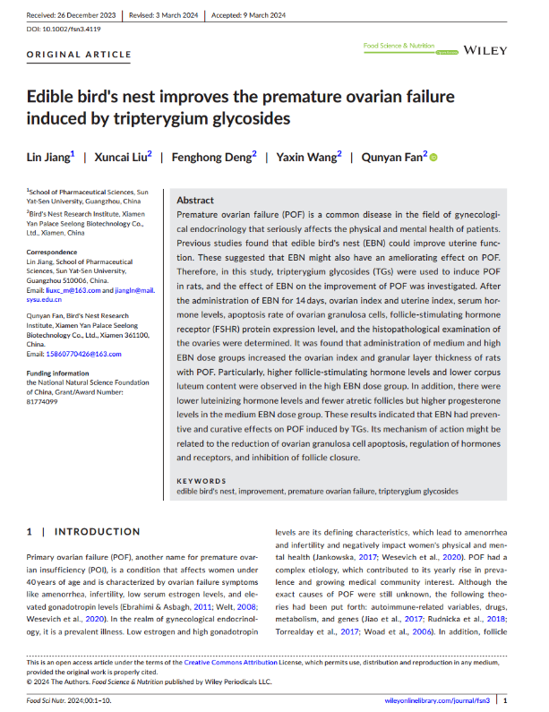 近日,燕之屋在食品科學(xué)領(lǐng)域取得了重大突破,其開展的一項(xiàng)題為“Edible bird's nest improves the premature ovarian failure induced by tripterygium glycosides”的研究成果被食品科學(xué)領(lǐng)域國(guó)際知名SCI收錄期刊《Food Science & Nutrition》正式收錄??茖W(xué)研究表明,燕窩對(duì)免疫制劑雷公藤多苷誘導(dǎo)的卵巢早衰有一定的預(yù)防和治療作用。其作用機(jī)制可能與減少卵巢顆粒細(xì)胞凋亡、調(diào)節(jié)激素和受體、抑制卵泡閉合有關(guān)。