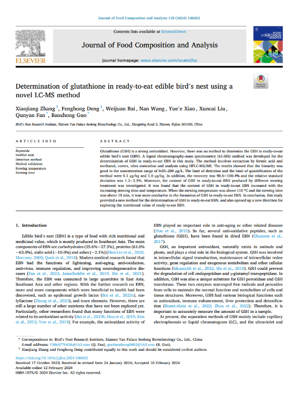 近日,燕之屋在食品科學領域取得了重大突破,開展的一項題為“Determination of glutathione in ready-to-eat edible bird’s nest using a novel LC-MS method”的研究成果被食品科學領域國際知名SCI收錄期刊《Journal of Food Composition and Analysis》正式收錄和發(fā)表,證實了該項研究成果具有科學性、創(chuàng)新性和可行性,具有推動燕窩行業(yè)的科學研究和產(chǎn)品創(chuàng)新的巨大潛力。該研究率先建立了一種用于測定即食燕窩中谷胱甘肽含量的液相色譜-質(zhì)譜法(LC-MS),具有準確、穩(wěn)定、快捷的優(yōu)點,能夠?qū)崿F(xiàn)對即食燕窩中谷胱甘肽含量的快速、準確測定,填補了行業(yè)在該領域的空白。