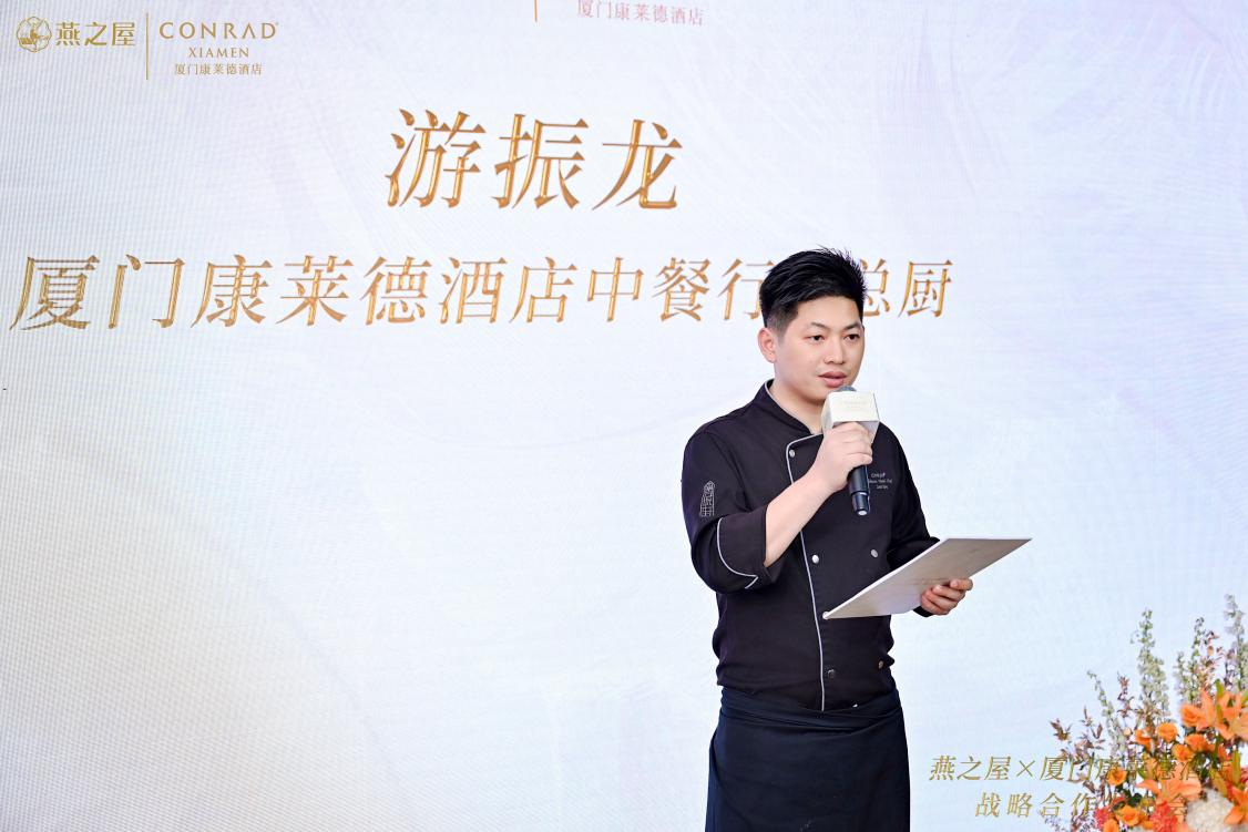 廈門康萊德酒店總經(jīng)理莫永泉也對(duì)此次合作滿懷期待,他在致辭中說道:“燕之屋作為一家26年的燕窩專營企業(yè),是中國上市的高品質(zhì)燕窩品牌,擁有廣泛的知名度與美譽(yù)度。康萊德品牌成立于1982年,是百年酒店管理公司希爾頓集團(tuán)旗下的奢華酒店品牌,倡導(dǎo)自信、創(chuàng)新與融合,我們的合作一拍即合。我們都知道好的菜品跟主廚的理解、烹飪方法和對(duì)食材品質(zhì)的挑剔,缺一不可。燕之屋的燕窩品質(zhì)是首屈一指的,非常榮幸可以有機(jī)會(huì)和燕之屋一起研發(fā)菜單。”