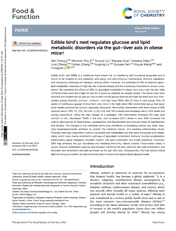 近日,燕之屋在食品科學(xué)領(lǐng)域取得了重大突破,開展的一項(xiàng)題為“Edible bird’s nest regulates glucose and lipid metabolic disorders via the gut–liver axis in obese mice”的研究成果證實(shí)燕窩(鮮燉燕窩)能夠通過腸-肝軸調(diào)節(jié)糖脂代謝紊亂,在解決與葡萄糖、脂質(zhì)和脂肪相關(guān)的代謝失衡方面起著關(guān)鍵作用;該研究成果被食品科學(xué)領(lǐng)域國際知名SCI收錄期刊《Food & Function》正式收錄和發(fā)表,不僅具備科學(xué)性、創(chuàng)新性和可行性,而且具有推動(dòng)燕窩行業(yè)的科學(xué)研究和產(chǎn)品創(chuàng)新的巨大潛力。