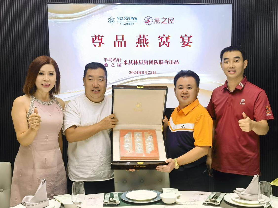 《米其林指南》是世界權(quán)威的美食指南之一,被評(píng)為米其林餐廳意味著卓越的品質(zhì)和服務(wù)。尊品燕窩宴菜單由半島名軒酒家(白云金控店)米其林星廚團(tuán)隊(duì)匠心定制,從食材到烹飪,從擺盤到成型,星廚嚴(yán)格把控細(xì)節(jié),意在為高品位人士帶來絕妙的美食盛宴。尊品燕窩宴以燕窩為媒,輔以時(shí)令食材,天然珍饈與粵式海味相得益彰,完美呈現(xiàn)中式滋補(bǔ)魅力,讓綿延千年*的中式滋補(bǔ)文化璀璨綻放(*“早在唐代我國就已用瓷器與北婆羅洲大尼亞巖洞所產(chǎn)的燕窩進(jìn)行物對(duì)物的交換,交換品也成為了宮廷的御用珍品。”《藥物與人》August 2000(Vol13)P349)。當(dāng)天,前菜-山莓戀燕,湯品-荷塘燕影,主菜-比翼雙飛燕、5J腿蓉燕窩扒雙蔬、陳皮燕窩和牛,主食-燕窩燒賣皇、桶仔燕窩撻,甜品-香檸杏汁官燕撈陸續(xù)上桌,組成一席金秋尊品燕窩宴,為在場人員帶來多重感官享受的用餐體驗(yàn),收獲在場人員的一致好評(píng)。