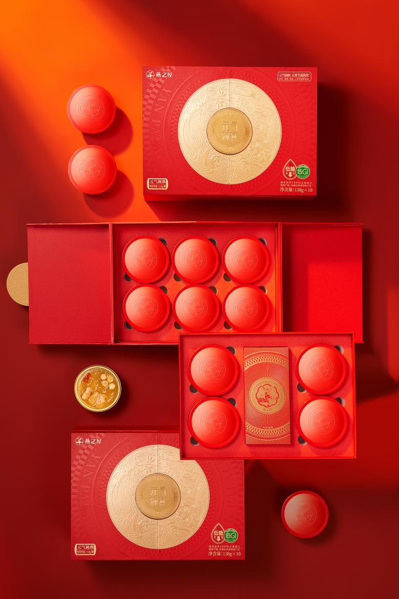 為長輩挑選滋補好禮,煥新升級的碗燕·元氣款禮盒實為優(yōu)先之選。中國紅與黃金色系的精美配搭,凸顯光亮色澤與尊貴質感,大方得體,有禮有面。禮盒設計圍繞“圓”的概念,以年輪為設計意象,象征歲月賦予的智慧,也傳遞著圓滿之意。盒上刻畫金燕反哺動人圖景,祥云繁花環(huán)繞其中,蘊藏濃厚情意。獨特的對稱開盒頗具巧思與創(chuàng)意,內(nèi)里雙層設計,共承十碗珍饈碗燕·元氣款,滿載濃濃營養(yǎng)與深切關懷,讓滋補觸手可及,關愛無處不在。