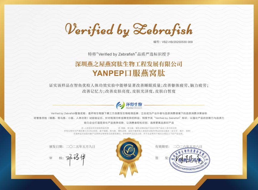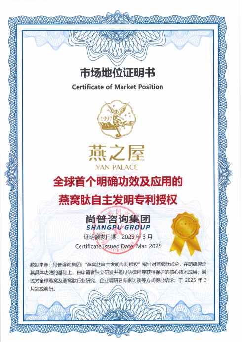 此認(rèn)證基于燕之屋獲得授權(quán)的發(fā)明專利“一種具有促進(jìn)細(xì)胞修護(hù)、高保濕美白功效的燕窩肽制備方法及應(yīng)用”(專利號:ZL 2022 11398048.3);實驗數(shù)據(jù):皮膚角質(zhì)層水分↑11.22%、表皮水分流失↓21.52%、眼角皮膚彈性↑3.17%、皮膚黑色素↓10.81%、皮膚血紅素↓12.77%、皮膚光澤度↑14.32%、眼角魚尾紋面積↓8.70%;延緩細(xì)胞衰老:Study of the antiaging effects of bird's nest peptide based on biochemical, cellular, and animal models(基于生化、細(xì)胞和動物模型的燕窩肽抗衰老作用研究)[J]. Journal of Functional Foods, 2023, 103: 105479.燕窩肽及相關(guān)產(chǎn)物與健康:研究概況[J].現(xiàn)代食品科技,2024,40(09):388-397.。