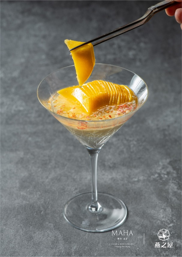 秋葵黃魚燕窩羹,燕窩經(jīng)凈水浸沐6小時(shí),換水滌塵,撕作雪絲隔水輕燉;黃魚淋開水封鮮,煎至金黃生香,搗碎入滾水熬至濃白;秋葵片灼水,如玉簪點(diǎn)入羹中。這一盅融深海之鮮、燕窩之潤(rùn)、青蔬之清——沿襲古法,讓食養(yǎng)同源的美味在舌尖化開。發(fā)酵酸湯龍蝦趴燕窩汁,龍蝦肉冷腌15分鐘,裹上特調(diào)漿粉炸出金黃蜂巢脆衣,咬下時(shí)“咔嚓”聲如秋葉碎響。番茄經(jīng)自然發(fā)酵成琥珀酸湯,澆淋現(xiàn)燉燕窩汁——酸鮮激蕩中,燕窩柔滑如綢緞?chuàng)徇^(guò)舌尖,是主廚獻(xiàn)給味覺(jué)的冒險(xiǎn)詩(shī)篇。芒果酒釀桂花蜜蛋糕配新鮮芒果及燕窩:“燕窩需隔水輕蒸,裹住桂花蜜的魂。”主廚將酒釀熬作凝脂奶凍,托起卡曼橘芒果慕斯的俏皮酸香。頂層燕窩如琉璃凍雨,新鮮芒果是點(diǎn)睛明月。撒入桂花,取“蟾宮折桂”的好兆頭。當(dāng)瓷勺探底——酒釀的醇厚、慕斯的輕盈、燕窩的滑潤(rùn)在口中共譜秋月的詩(shī)篇。